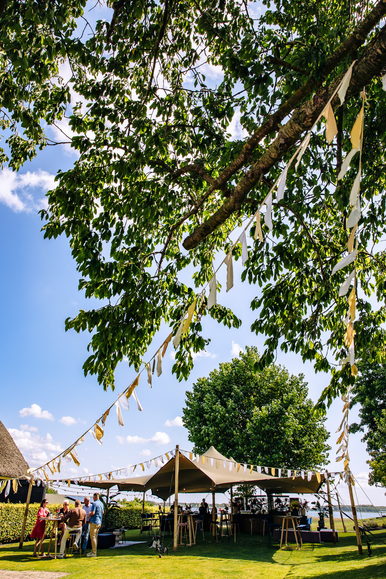 Een stretchtent vormde de basis, die we aanvulden met frisse kleuraccenten en een speelse combinatie van materialen. Zo kreeg de setting karakter, stijl en een vleugje verrassing.